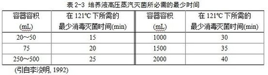 使用高壓蒸汽滅菌器滅菌時(shí),將分裝好的培養(yǎng)液放入底部有一定量(淹沒(méi)加熱管)涼水的高壓蒸汽滅菌器內(nèi),增壓**0.35~0.4 kg/cm2時(shí)排凈滅菌器內(nèi)冷空氣,以便使蒸汽能到達(dá)各個(gè)消毒部位,保證消毒滅菌徹底。然后繼續(xù)加壓加熱,當(dāng)壓力表讀數(shù)達(dá)到1.0~1.1 kg/cm2為121 ºC,保持15~20 min即可。由于消毒滅菌效果取決于溫度而不是壓力,所以在一定壓力下保持較長(zhǎng)的消毒滅菌時(shí)間是必須的。在121 ºC的蒸汽溫度下可以很快殺死各種細(xì)菌及高度耐熱的芽孢桿菌,因此許多培養(yǎng)液的消毒滅菌壓力、溫度一般保持在1.0~1.1 kg/cm2、121 ºC。消毒滅菌時(shí)間與需要消毒滅菌的培養(yǎng)液量密切相關(guān)(表2-3),時(shí)間不足達(dá)不到滅菌效果,時(shí)間過(guò)長(zhǎng)培養(yǎng)液內(nèi)的一些化學(xué)物質(zhì)遭到破壞,影響培養(yǎng)液成分。消毒滅菌結(jié)束后,關(guān)閉熱源,只有當(dāng)滅菌器內(nèi)壓力降為零時(shí)才能打開(kāi)放氣閥,排除剩余蒸汽,取出培養(yǎng)液。不可在壓力較高時(shí)打開(kāi)放氣閥,引起減壓沸騰,使容器中液體溢出。培養(yǎng)液組成中如含有遇熱易分解的物質(zhì),則需用過(guò)濾方法消毒滅菌。shou先對(duì)培養(yǎng)液中耐熱組分進(jìn)行高壓蒸汽滅菌后放置在無(wú)菌場(chǎng)所,固體培養(yǎng)液在40 ºC左右瓊脂即將凝結(jié)前,加入經(jīng)過(guò)過(guò)濾除菌的不耐熱溶液,混勻后冷卻備用。液體培養(yǎng)液在冷卻到室溫后再加入過(guò)濾除菌溶液。過(guò)濾除菌時(shí),使用孔徑為0.22~0.45 μm或更小的細(xì)菌濾膜。過(guò)濾除菌可利用抽濾裝置或注射過(guò)濾器進(jìn)行,所用器皿均應(yīng)進(jìn)行高壓消毒滅菌,溫度不應(yīng)超過(guò)121 ºC。